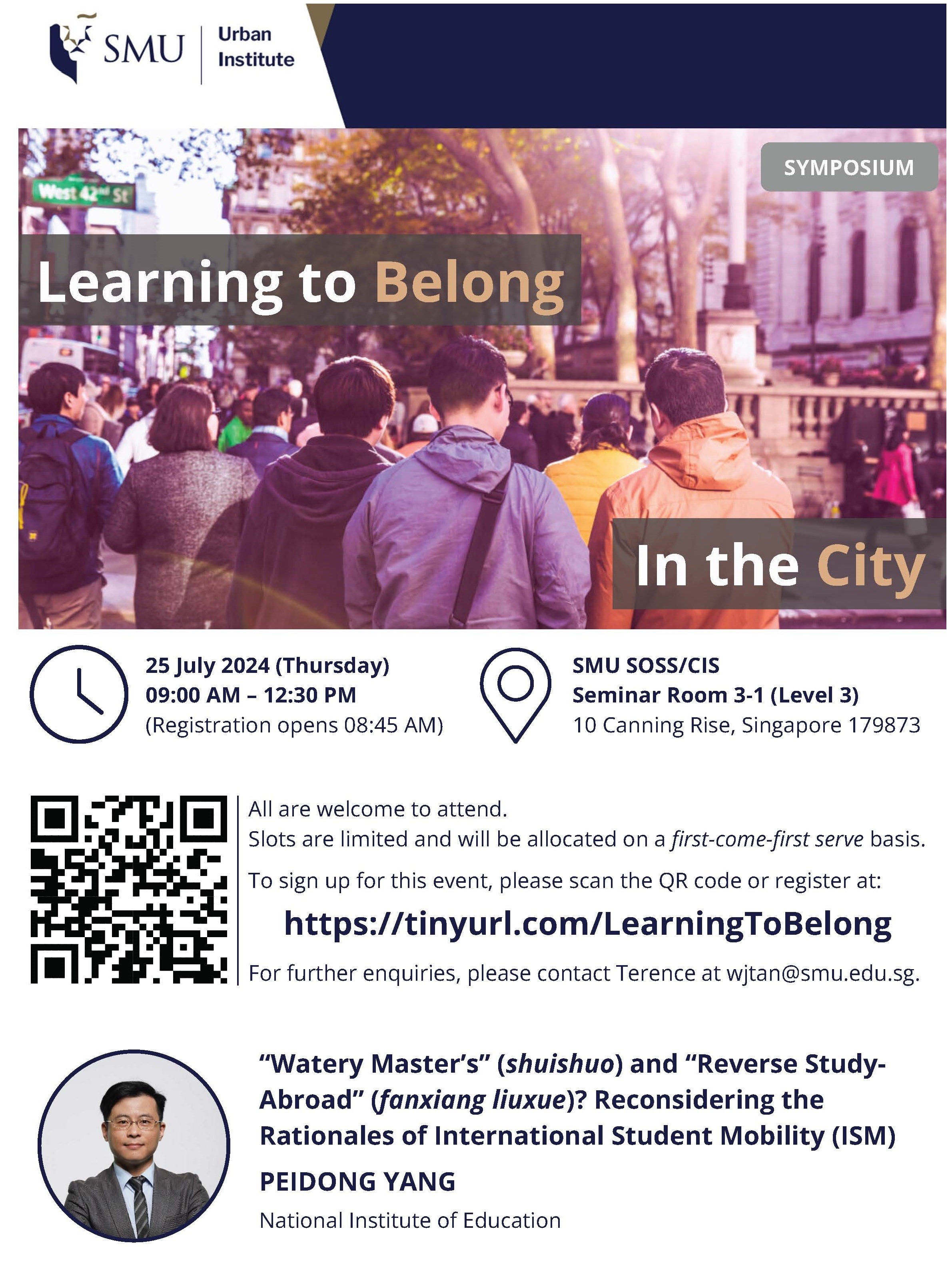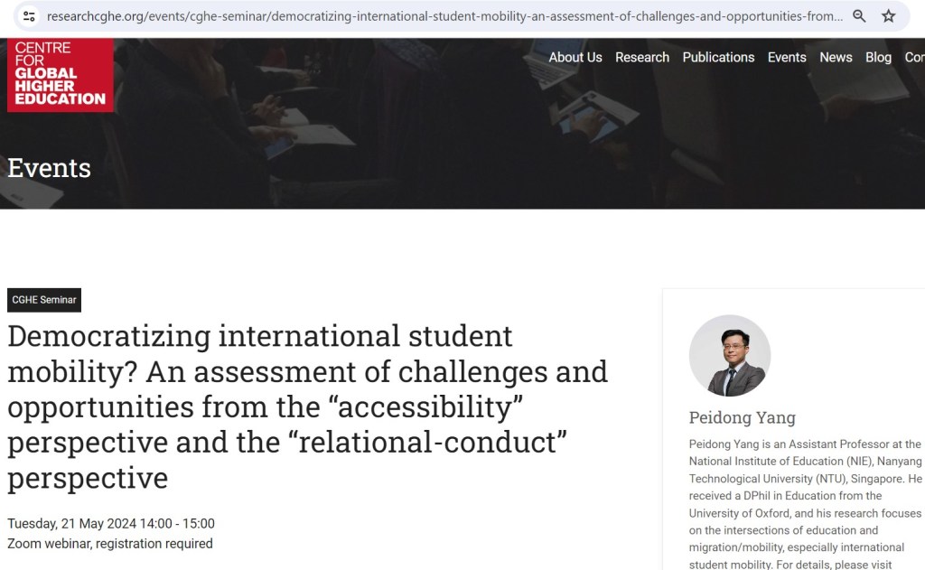 应新加坡管理大学(Singapore Management University, SMU) 城市研究所 (Urban Institute)Orlando Woods教授之邀,将参与2024年7月25日星期四上午 主题为Learning to Belong in the City 关于国际学生的研讨会。会上,我将做题为“ ‘水硕与’反向留学‘? 在新加坡就读一年制硕士中国学生的案例教我如何重新思考国际学生流动“的研究分享。线下活动,欢迎注册参与!