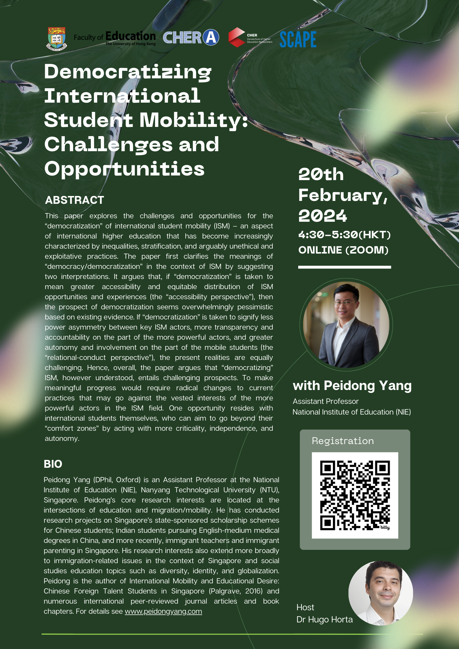 应新加坡管理大学(Singapore Management University, SMU) 城市研究所 (Urban Institute)Orlando Woods教授之邀,将参与2024年7月25日星期四上午 主题为Learning to Belong in the City 关于国际学生的研讨会。会上,我将做题为“ ‘水硕与’反向留学‘? 在新加坡就读一年制硕士中国学生的案例教我如何重新思考国际学生流动“的研究分享。线下活动,欢迎注册参与!